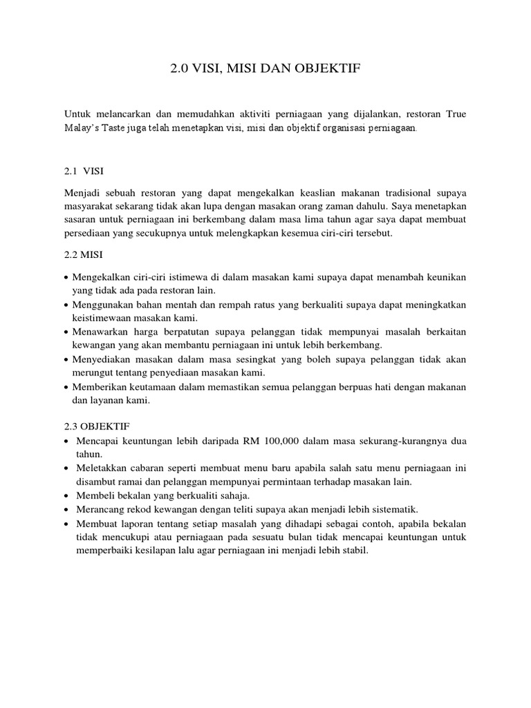 Post a Comment for Contoh Visi Misi Dan Objektif Perniagaan Makanan Food Truck. Sepanyol dan Portugis menjalankan misi agama Kristian dan perdagangan. Misi adalah Penjabaran atau langkah-langkah yang akan dilakukan untuk mencapai mewujudkan visi tersebut.